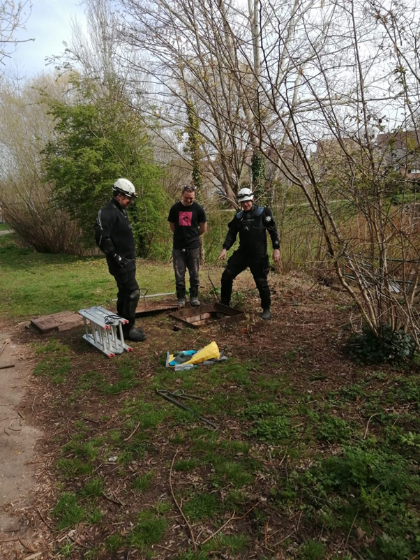 An unusual, but welcome, site in the park yesterday as divers came to inspect the penstocks (like sluice gates) that lie on the outlets to our main ponds. I had heard these things existed but was delighted to see them for myself. They can be adjusted to regulate the water flow. These guys have also been sampling the silt to check its depth and assessing contamination near the footbridge.